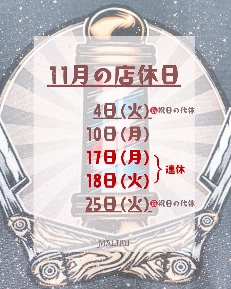 | ★カット (シェービング+シャンプー込) 大 人 ¥3,000 高校生 ¥2,500 中学生 ¥2,500 ※中学生未満のお子様 現在、新規受付はしておりませんm(_)m ★特殊カット(シェービング+シャンプー込) 角刈り.GIカット.フェード.アート.ライン引き等 大人 ¥3,500~ ★中·高校生のフェードカットについて 料金:大人カット料金 ★カラー (カット+シェービング+シャンプー込) 茶、アッシュ、マット、ミルキーグレージュ系、レッド、ブルー、原色系など おしゃれ染め ¥5,500〜 ブリーチ+カラー ¥9,000~ ホワイトブリーチ ¥18,000~ 白髪染め 黒 ¥5,500〜 白髪染め 茶 ¥5,500〜 白髪ぼかし ¥5,500〜 ★パーマ (カット+シェービング+シャンプー込) ウエーブ ¥6,800〜 スパイラル¥7,800〜 ショートスパイラル ¥8,500〜 ツイスト ¥8,500〜 アフロツイスト ¥13,000〜 メッシュパーマ ¥6,800~ パンチ ¥6,800〜 アイパー ¥6,000〜 ダウンパーマ ¥5,000~ アイレスパーマ ¥5,000~ 縮毛矯正 ¥8,000〜 ストレート¥8,000〜 アフロ 時価 ホワイトブリーチなど時価 ※当店では お肌に優しい〜 ナプラ オーガニックシャンプー & コンディショナーを使用しております。 低刺激でしっとりした仕上がり♪ かっこよく仕上げます☆ 詳細は次ページにて |